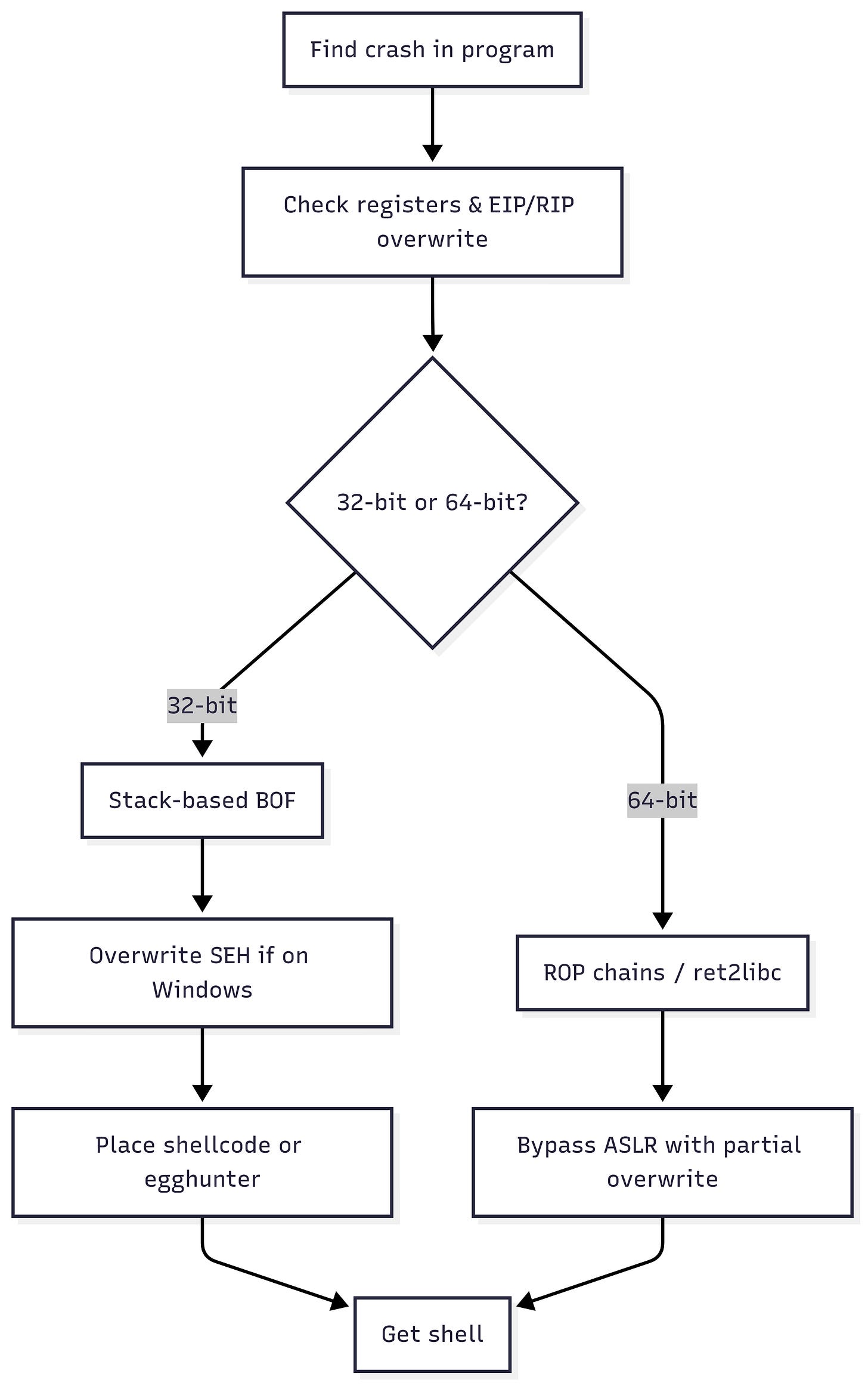 32/64-bit BOFs Exploits differ between architectures. 32-bit is often easier (linear memory, smaller addresses), while 64-bit introduces calling conventions and larger addresses.